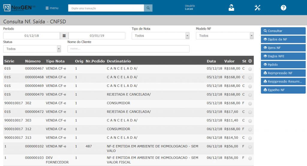 Objetivo: Nesta transação realiza-se a consulta de qualquer nota ou cupom que tenha saído do sistema em um determinado período, tendo ela sido cancelada, fechada ou não. Podendo o usuário visualizar os dados e itens da NF, o status, o dia que foi emitida, o pedido e o valor, além de poder reimprimi-la.