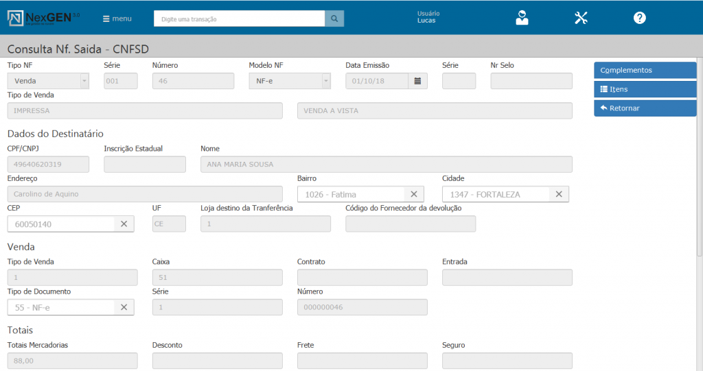 Dados da NF: Mostra todos os dados de emissão do documento, como o tipo, modelo, data, série e número, além dos dados do destinatário, as informações de tributos e da mercadoria. Dentro da janela ainda existe a opção de acessar os Complementos e os Itens da NF.