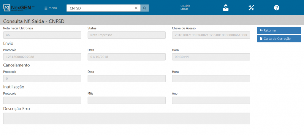 Acima temos a tela de Dados da NFE, os botões do lado direito acessam a carta de correção ou retorna para a tela anterior.