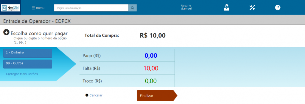Finalizar: Após executar os passos anteriores e o valor na lateral direita for o mesmo do total, clique em finalizar.