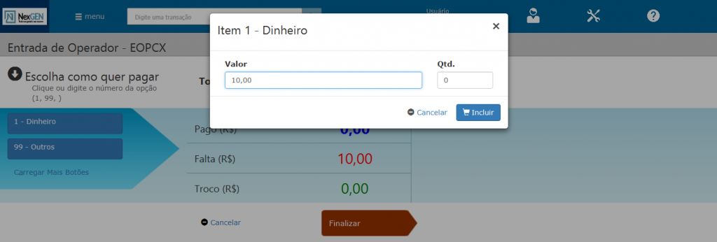 Incluir: Após informar o código referente a forma de pagamento clique em “Incluir” para adicionar o item de caixa e seu valor.