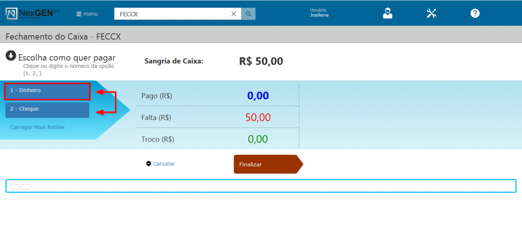 - No campo “Sangria” você irá inserir o valor total do caixa.