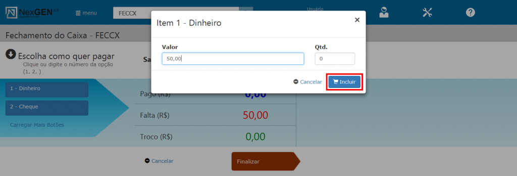 Clique no botão “Incluir” e a janela fechará e retornará para a transação anterior com o valor e o tipo de pagamento incluso.