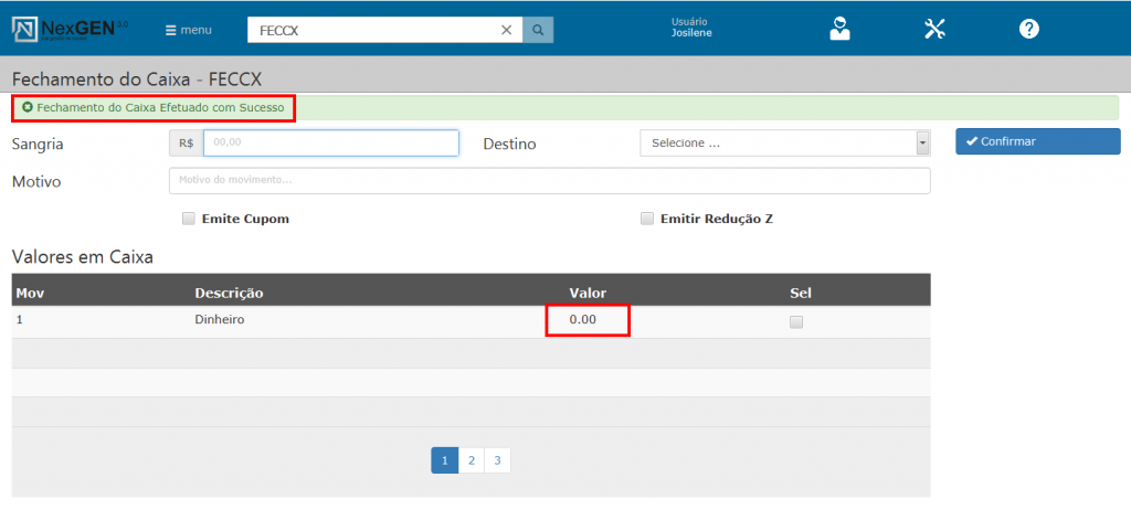 O primeiro passo para fazer o fechamento, ainda contendo valores no caixa, é fazer a sangria total do valor do caixa. Essa mesma transação permite isso.