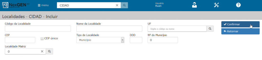 Novo: Inicia o cadastro de uma nova localidade.