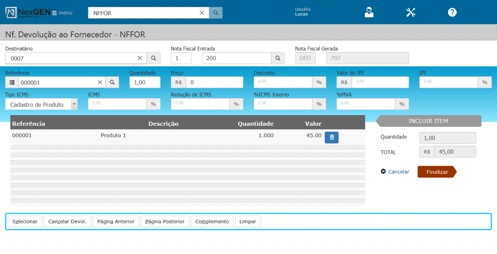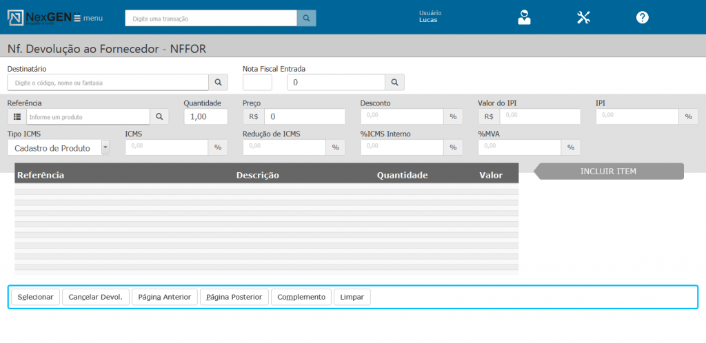 O usuário deverá informar o destinatário (credor), a nota que será devolvida (série e número) e fornecer as informações do(s) produto(s) que quer devolver, são eles: a própria referência, a quantidade, o preço (depende da parametrização) e os impostos, após isso, basta incluir.