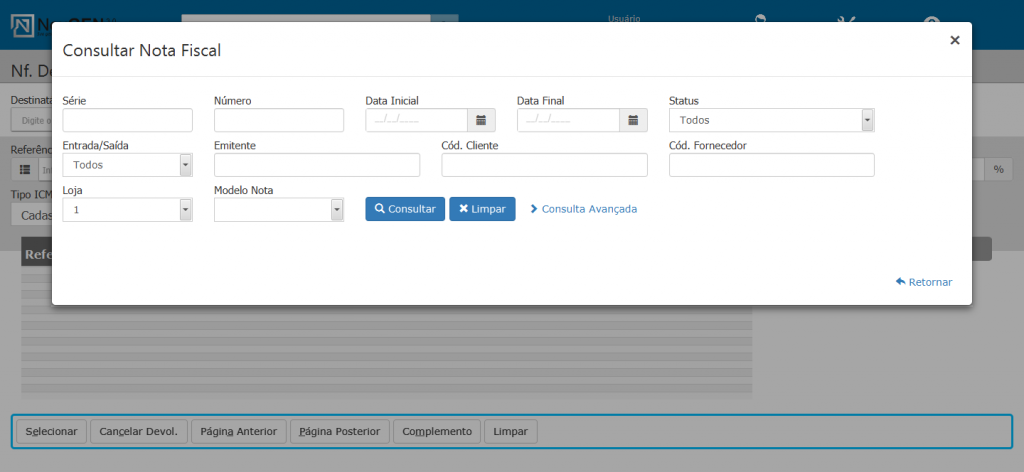 SELECIONAR → O botão serve para abrir uma janela onde o usuário poderá consultar uma nota DFO para continuar o processo de devolução.OBS.: DFO é um tipo de nota gerencial interna, gerada após o usuário começar o processo de devolução.