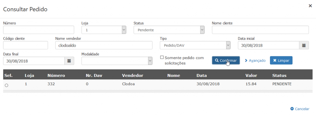 Neste caso, basta utilizar o botão “Consultar” digitar o número do pedido e clicar em “confirmar”, que o programa chamará o pedido do cliente, caso não saiba o numero do pedido, você pode realizar uma busca do pedido no sistema, para isso, basta clicar em “avançado” que o sistema irá exibir filtros que facilitarão a sua busca.