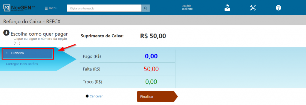 Clique no botão referente ao tipo de pagamento que está entrando no caixa, por exemplo: dinheiro.