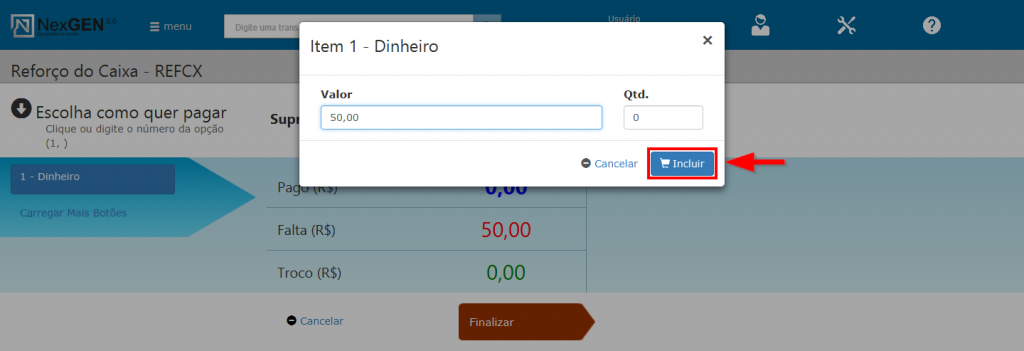 Clique no botão “Incluir”. A janela fechará e a inclusão do valor e forma de pagamento serão exibidos no lado direito da transação.