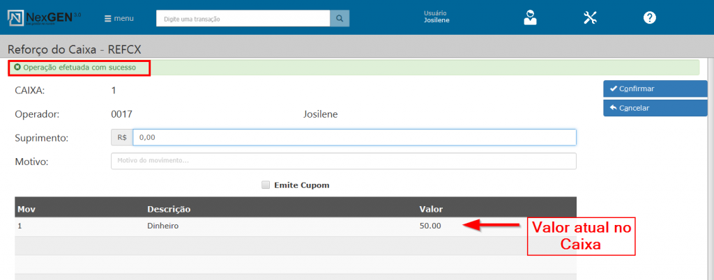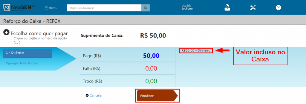 - Em “Motivo” o usuário irá informar o motivo pelo qual está realizando este reforço. Este é um campo obrigatório e muito importante, pois este motivo é exibido nos relatórios de Caixa.