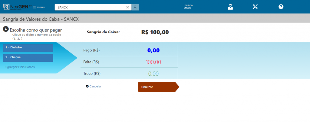 Objetivo: Esta transação serve para o usuário efetuar a retirada de valores do caixa. O sistema permite a sangria parcial ou integral nesta transação, cabe ao usuário escolher o valor da sangria. Porém para efetuar o fechamento do caixa, a sangria terá que ser integral.