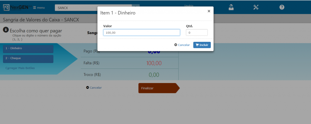 Sangria: Você irá inserir um valor, parcial ou total em relação ao valor que tem em caixa.
